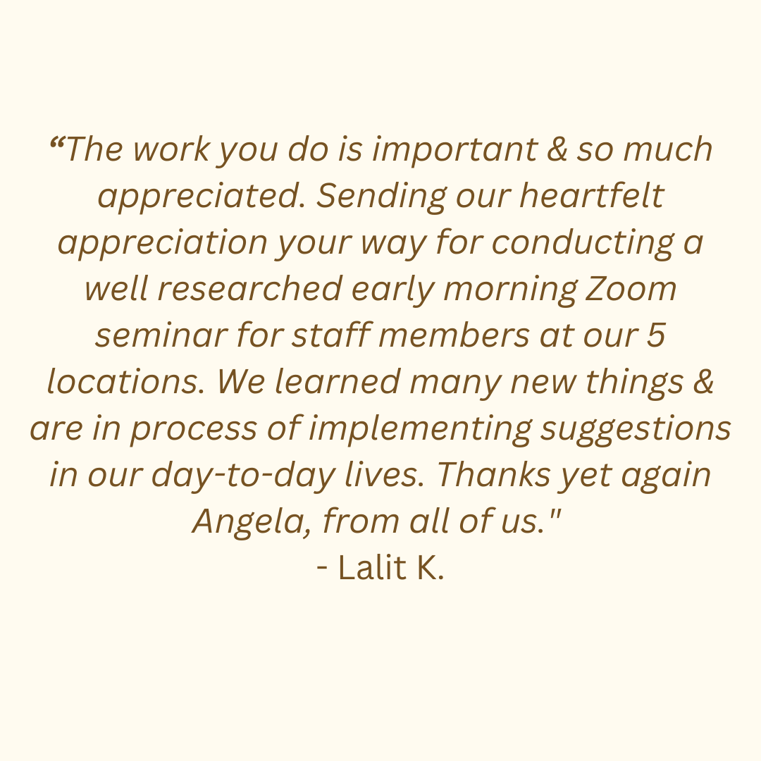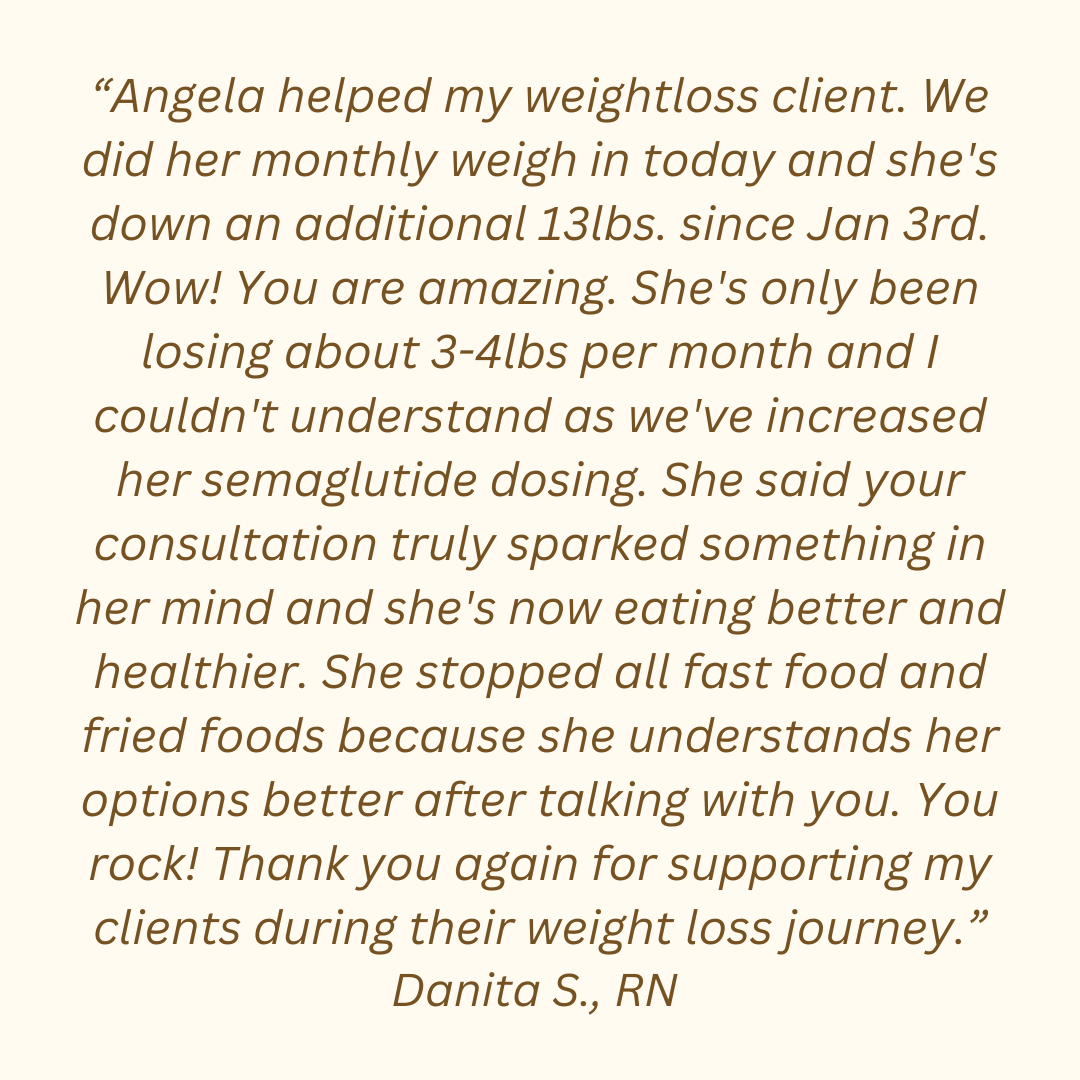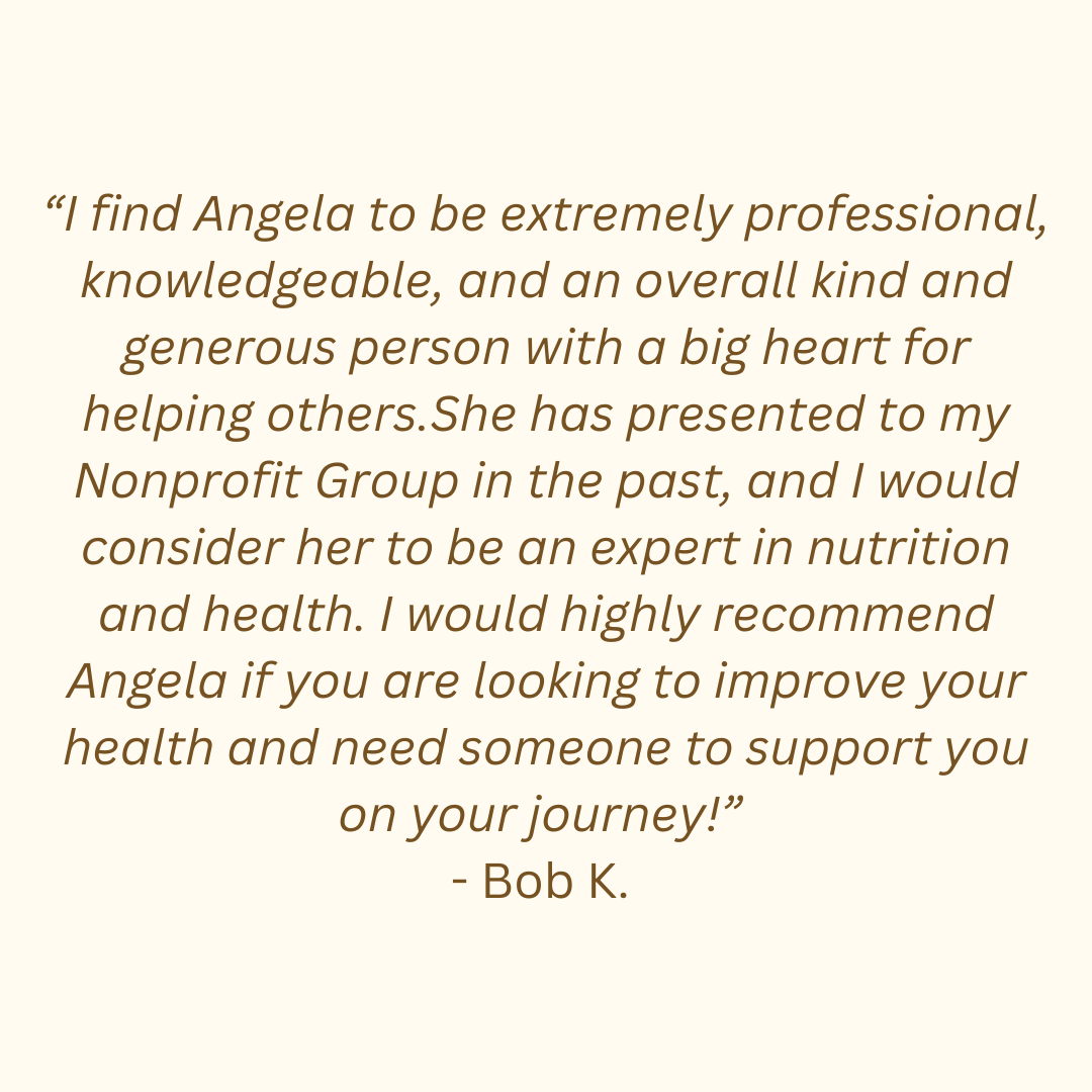 Education is critical to changing your lifestyle for life. With Angela’s teaching and support, you will understand the importance of the habits and skills you are building and how each plays a role in creating a healthier, happier you.